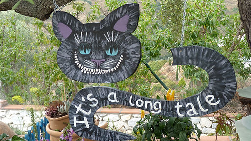 Lurking in the boughs of the olive tree is the Cheshire cat, painted by my daughter Grace. His “Long Tale” twitches in the breeze, “We´re All Mad Here” painted the length of it.